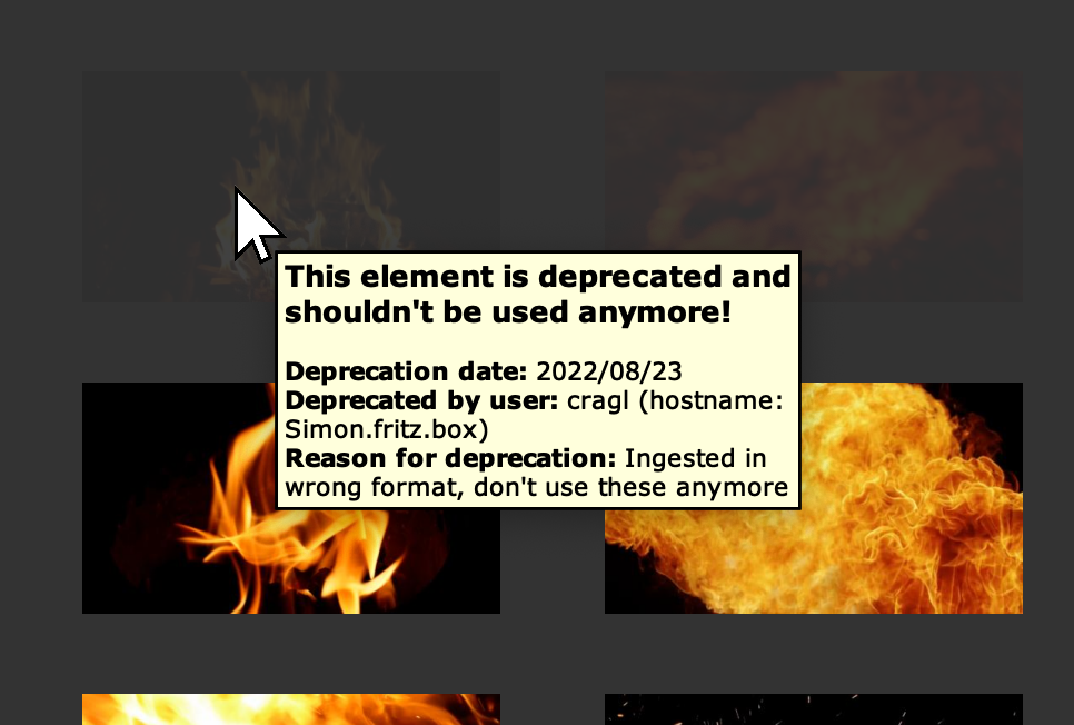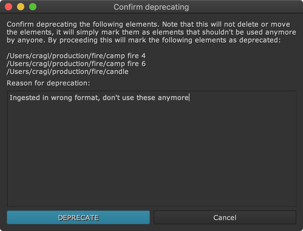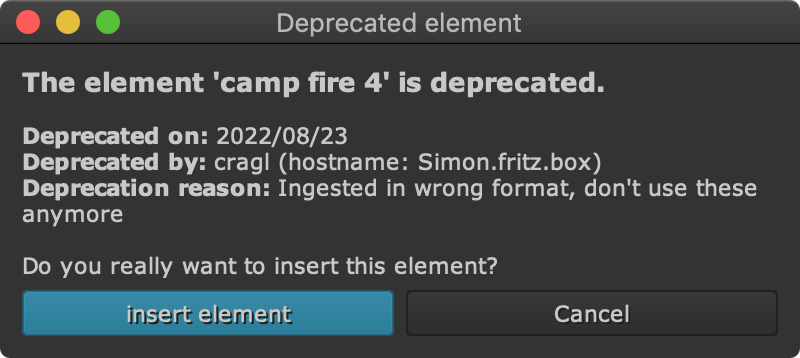After having worked with an element library for some time you might desire to deprecate certain elements, i.e. mark them as “Don’t use this element anymore”. Once an element has been ingested, it should however not be deleted anymore because it might eventually have been referenced in a production working file. Deleting an element might risk breaking existing working files that referenced these element. So how to handle this? In version 2.15.0 we have enabled a feature to mark an element as deprecated to inform users that they shouldn’t be using an element anymore. By not using it anymore, it gets deprecated over time and after some time it might be more secure to delete it. When to delete it and if ever deleting it at all is in your decision; We recommend not deleting anything once it has been ingested.