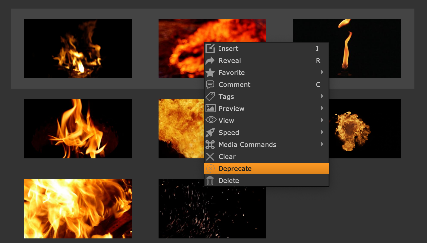 smartElements lets you trigger any custom commands on selected media. These commands are available in the ‘Media Commands’ menu of the context menu that appears when right clicking any media inside smartElements: