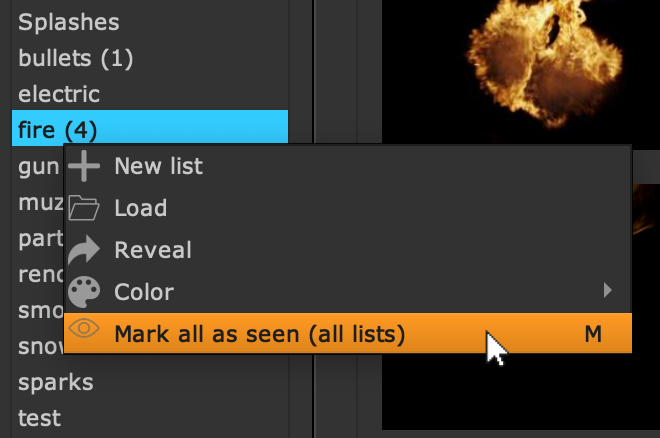 Right click any list in the list section and choose ‘Mark all as seen (all lists)’ to mark all elements in all lists as seen: