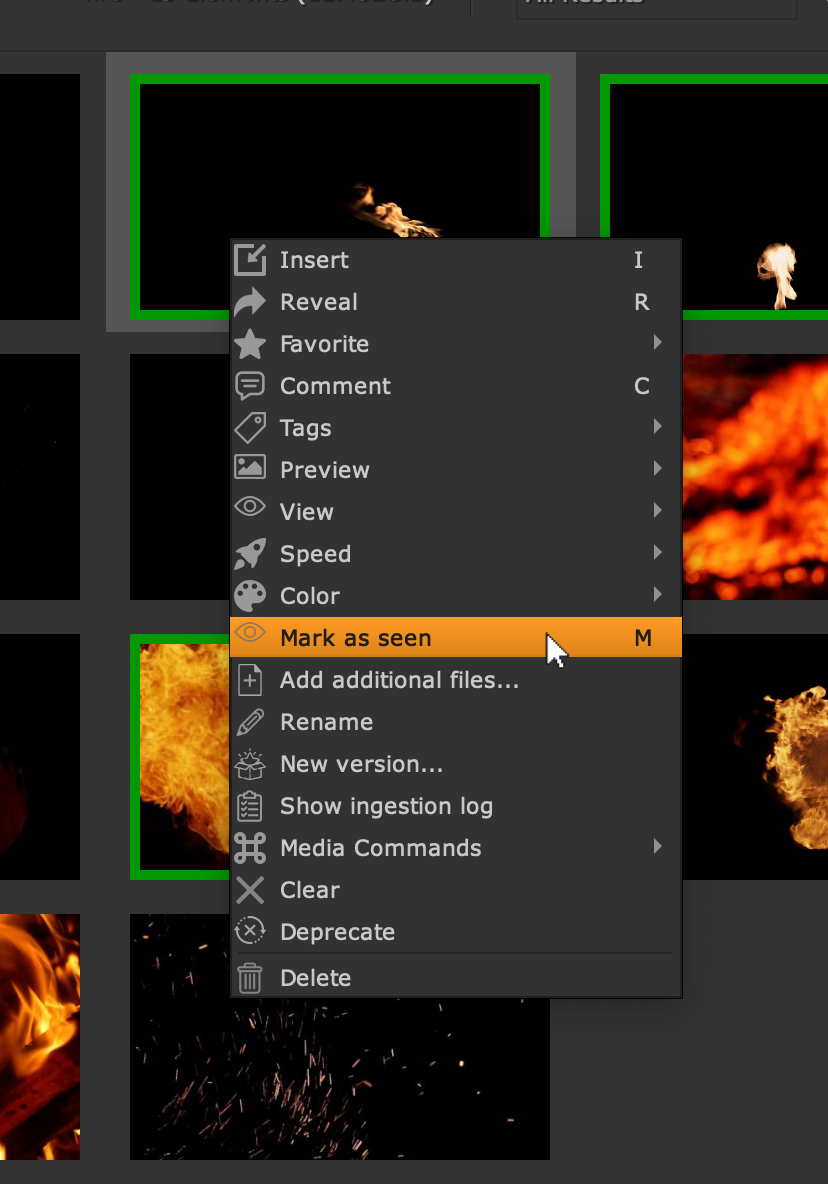 To mark an element as seen (and thus to remove the green border) select one or multiple elements and choose ‘Mark as seen’ from the context menu (shortcut: M) :