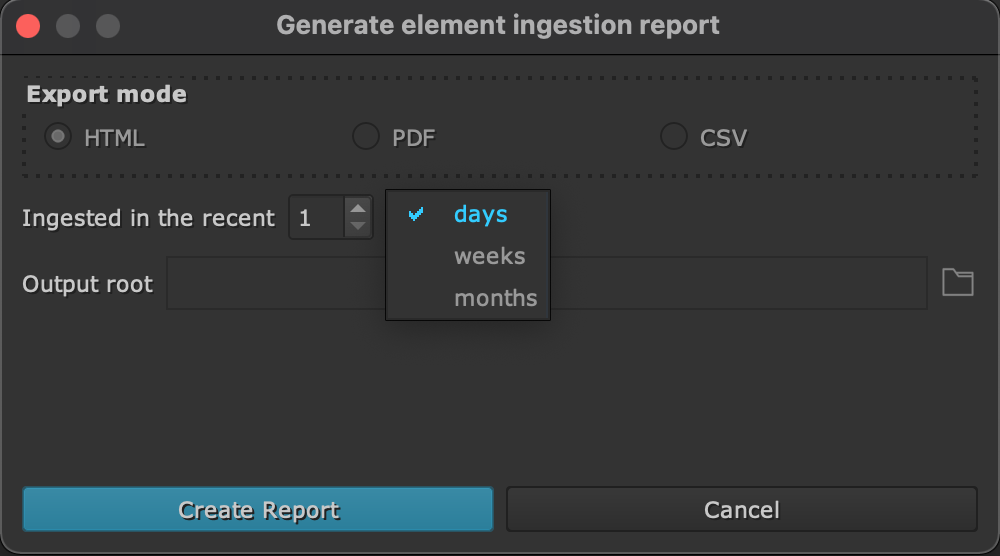 This launches a dialog in which you can specify the time range of newly ingested elements to put into a report. You can export as HTML, PDF and CSV file. Choose an export root directory and click the create button: