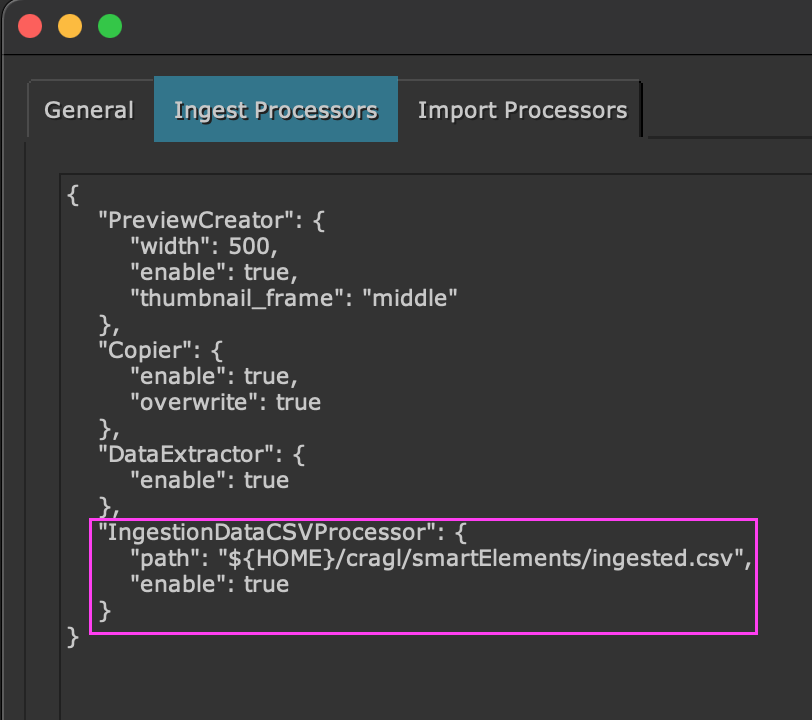 In the smartElements ‘Ingest Processors’ settings you can set the path where to save the csv file to. The csv file will only be created when ‘enable’ is set to ‘true’ (the default value). Set it to ‘false’ to turn this off.