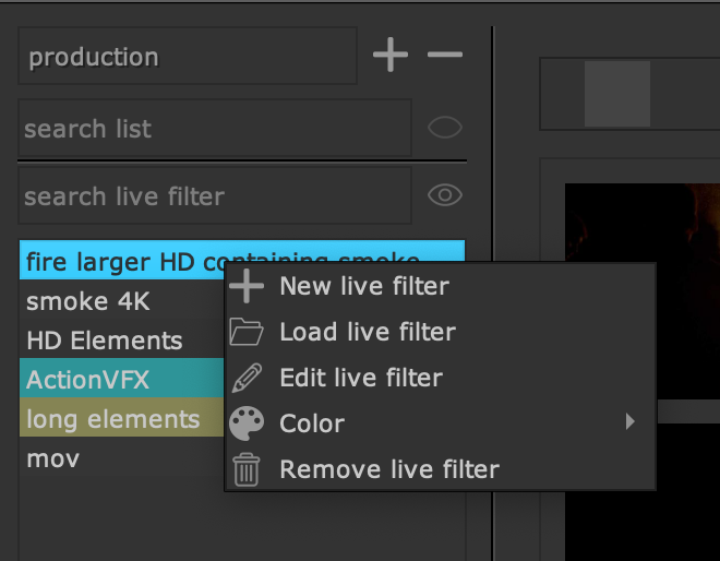 To apply a live filter, double click it or right click it and choose ‘Load live filter’ from the context menu. In the context menu you can edit live filter, assign a custom color to them and also remove them again when they are no longer needed.