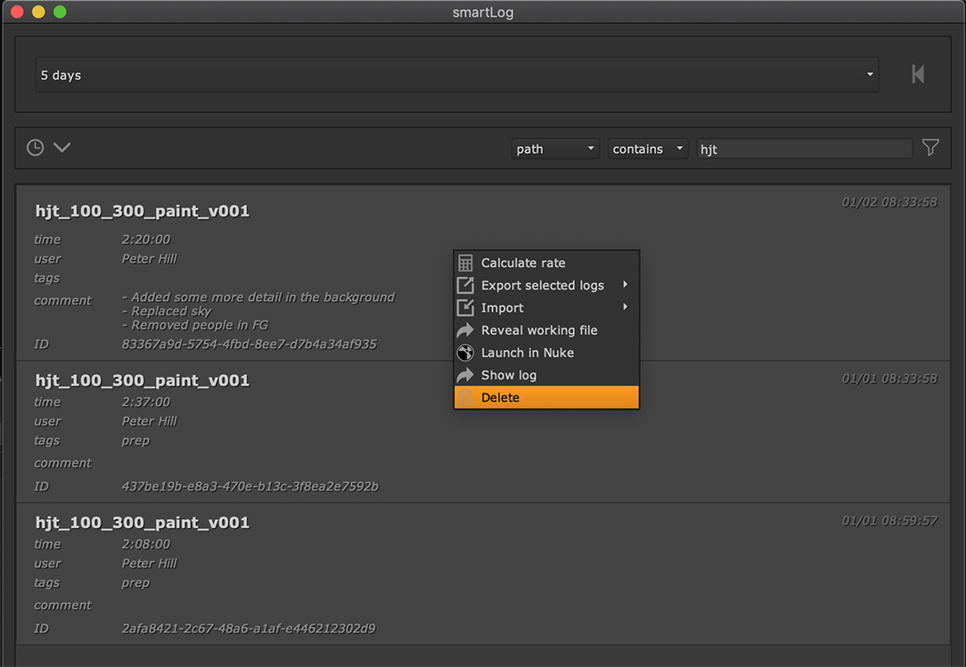 We can now remove the time logs from smartLog. Right click the selected time logs and choose Delete from the context menu: