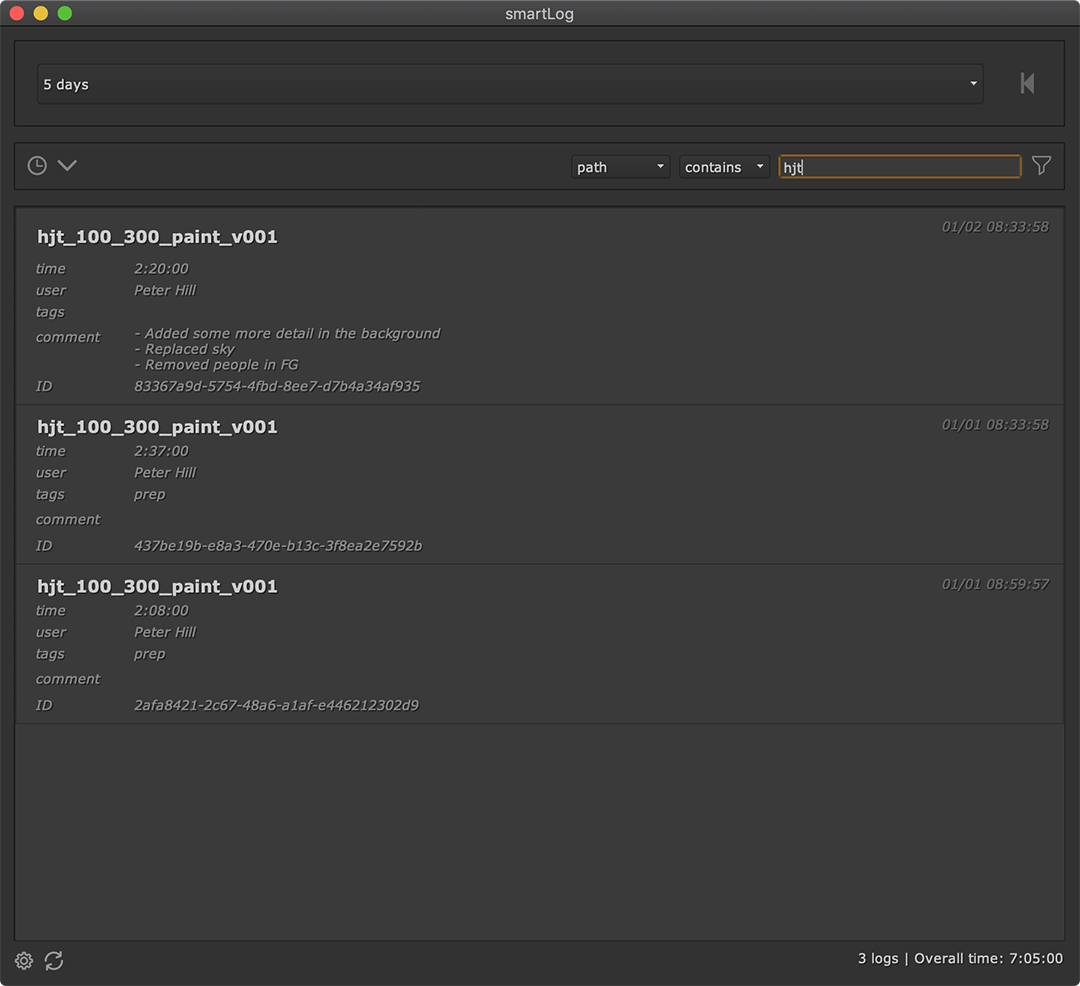 At the bottom right we see that this filter results in having 3 logs and an overall time of 5 hours and 5 minutes.