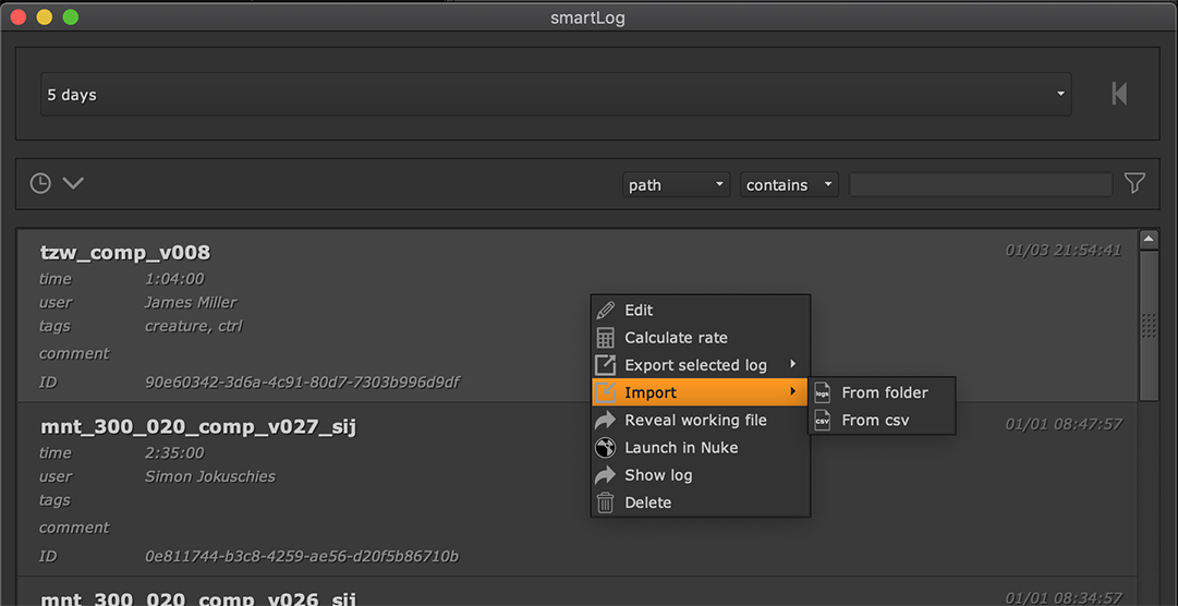 From here we have the option to import from a folder. This will import all time log .json files from one specific path that we browsed to. As we have exported our time logs to csv, let’s click the from csv command, browse to our exported csv file and click open. The time logs get imported back into smartLog.