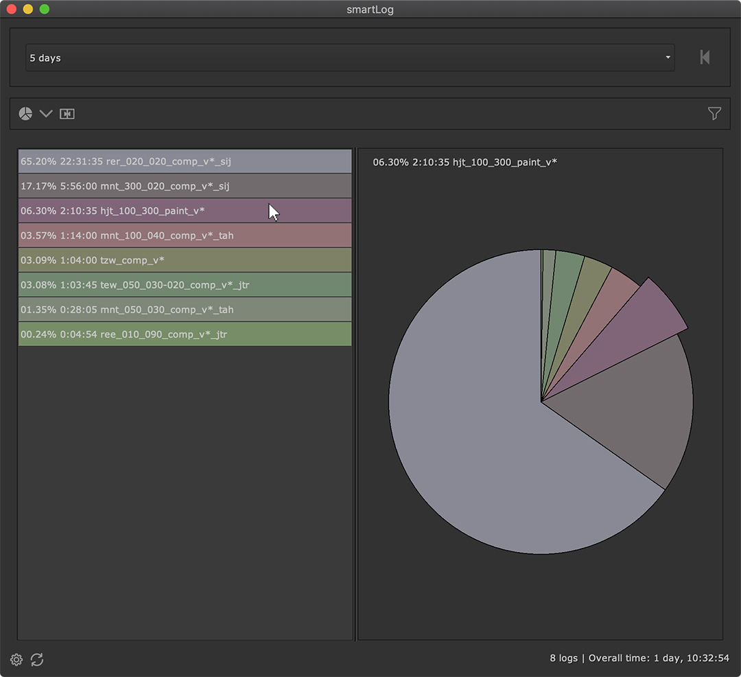 This viewing mode shows a pie diagram that displays the time being spend compared to other working files. This mode contains a merged and unmerged mode too, so we can see the overall time that was spent on a task and time that was spent on individual versions.