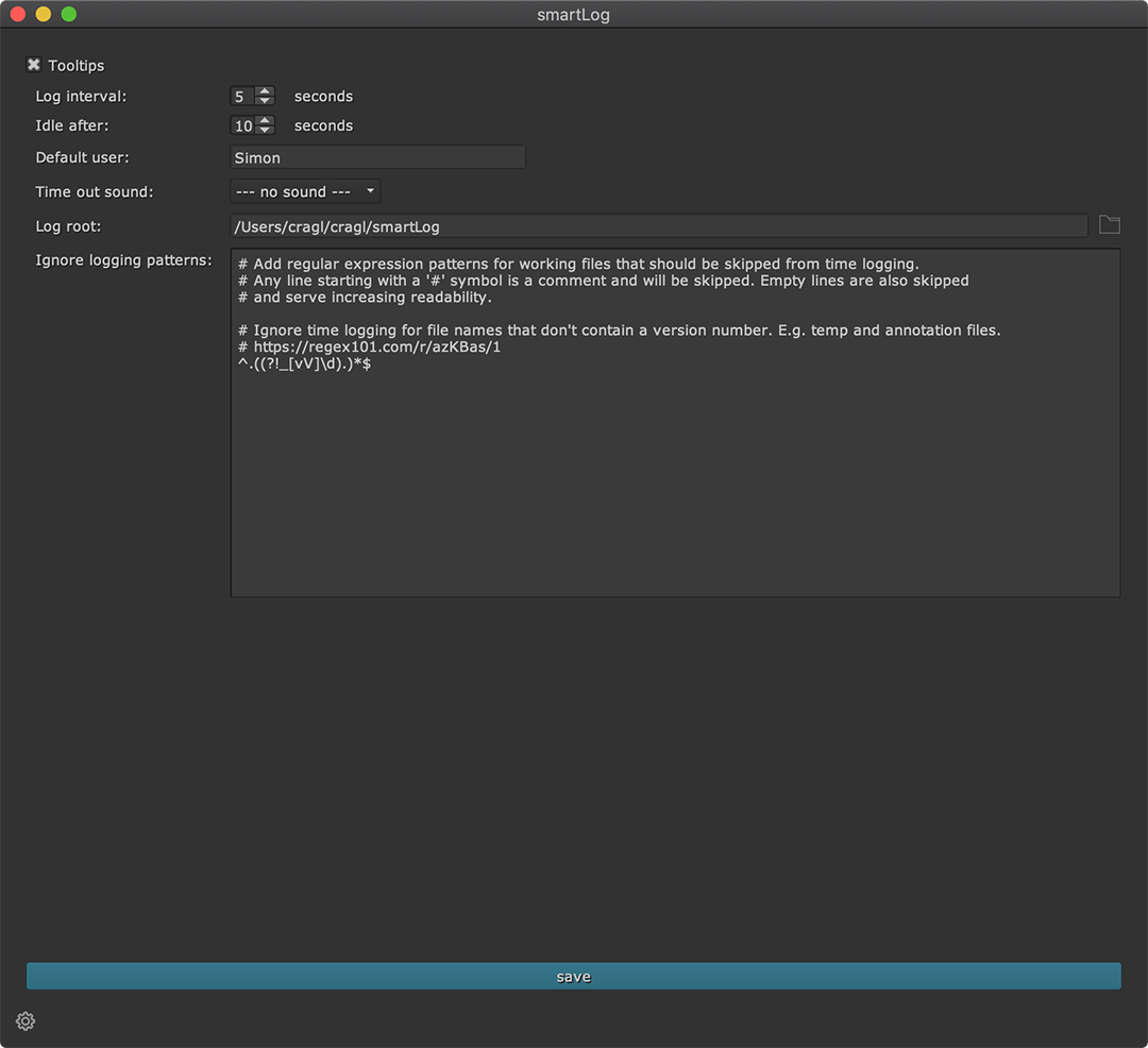 There are several things to customize here. All offered settings get described in more detail in the settings section. Let’s have a quick tour of how to set the time logs root and learn about ignoring certain working files.