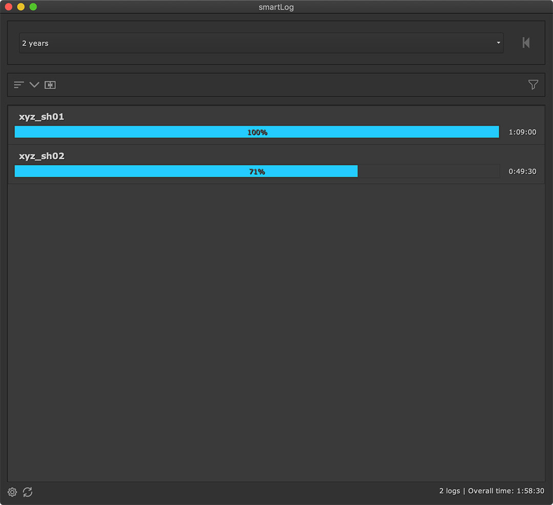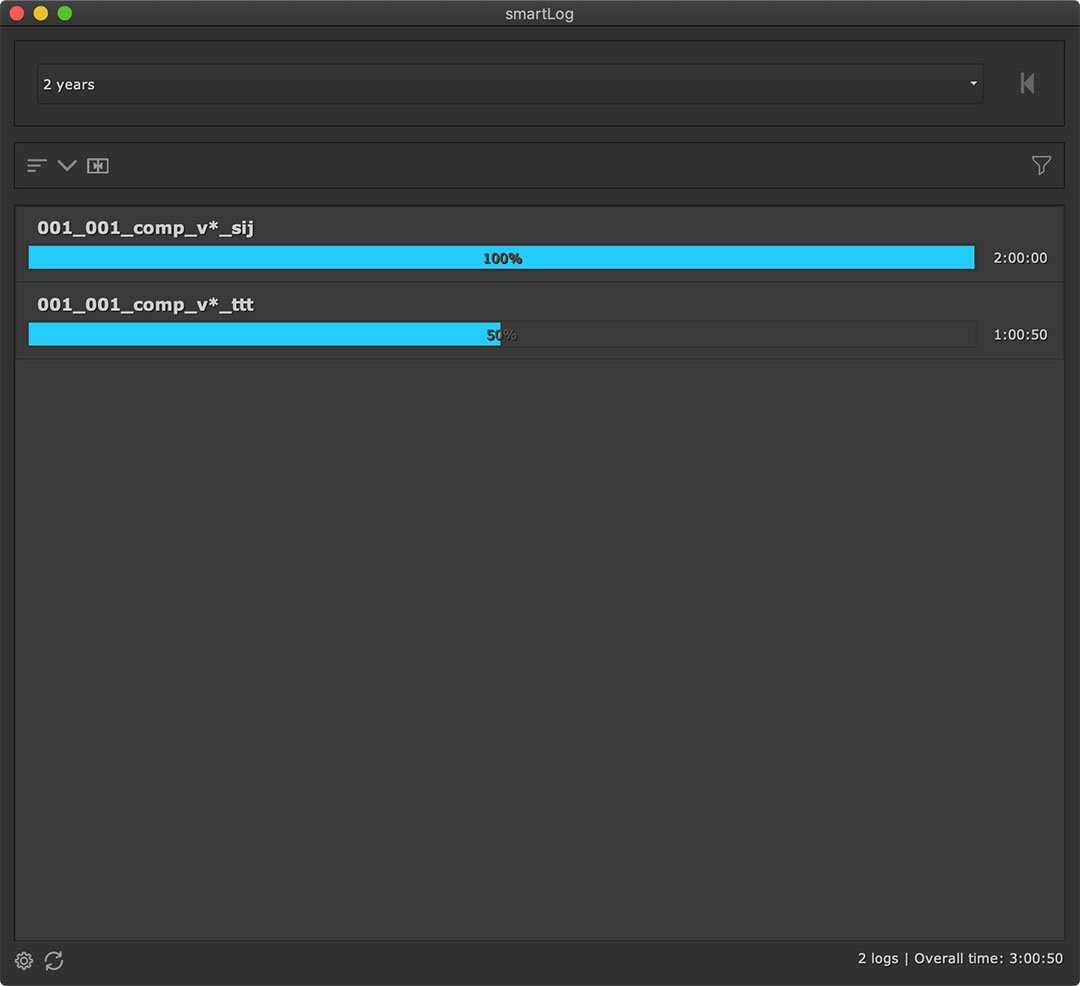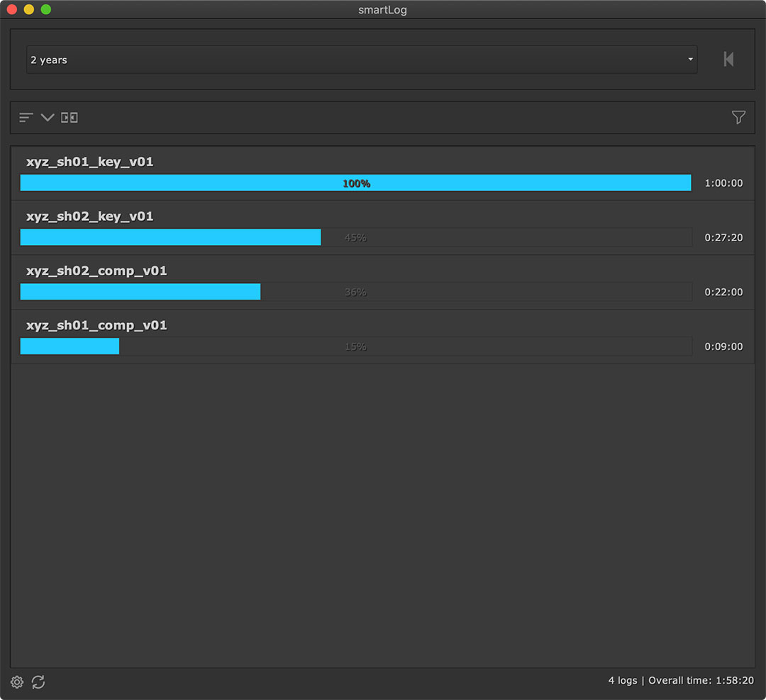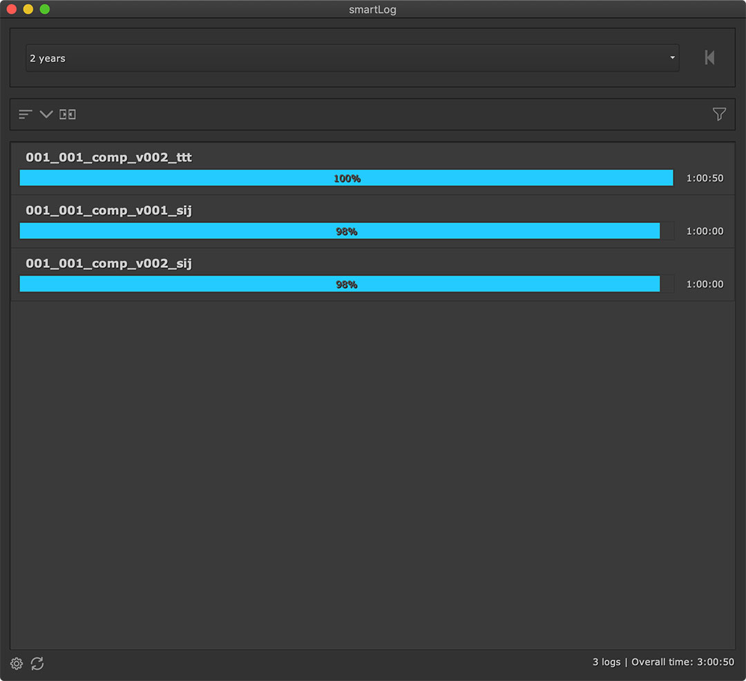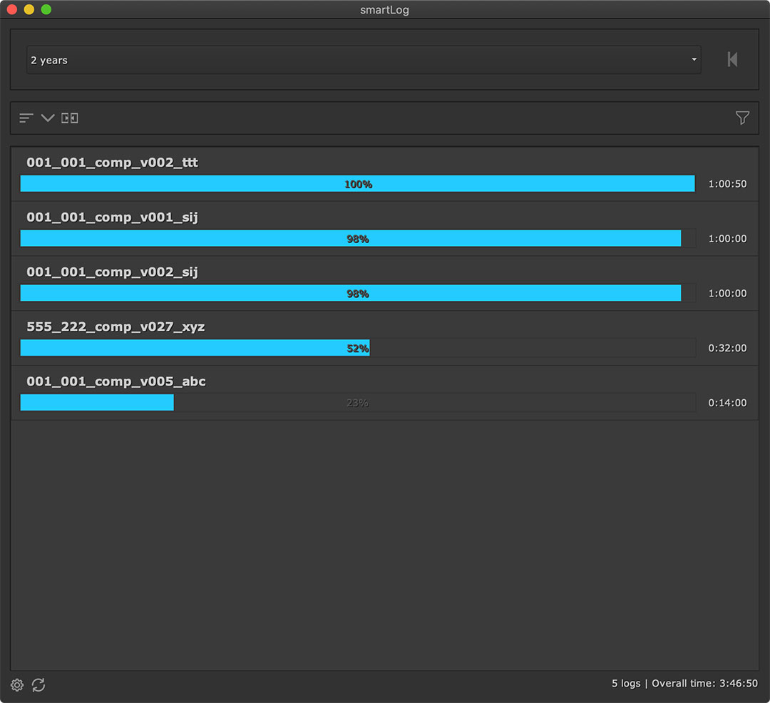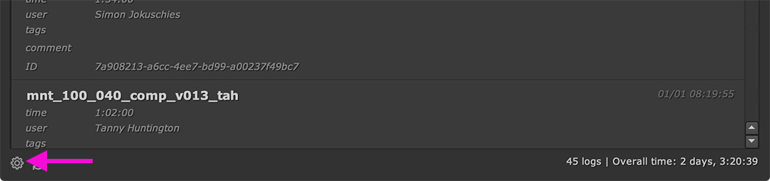The merge function lets you merge and un-merge certain working files. File naming is likely to change from company to company so we made this feature configurable. Since version 1.1, the settings section contains a text field called Substring ignore pattern which you can use to your advantage to take over full control on defining which time logs to merge. With that you can merge time logs by show, sequence, shot, task, user or any combination of these or even in a completely different way.