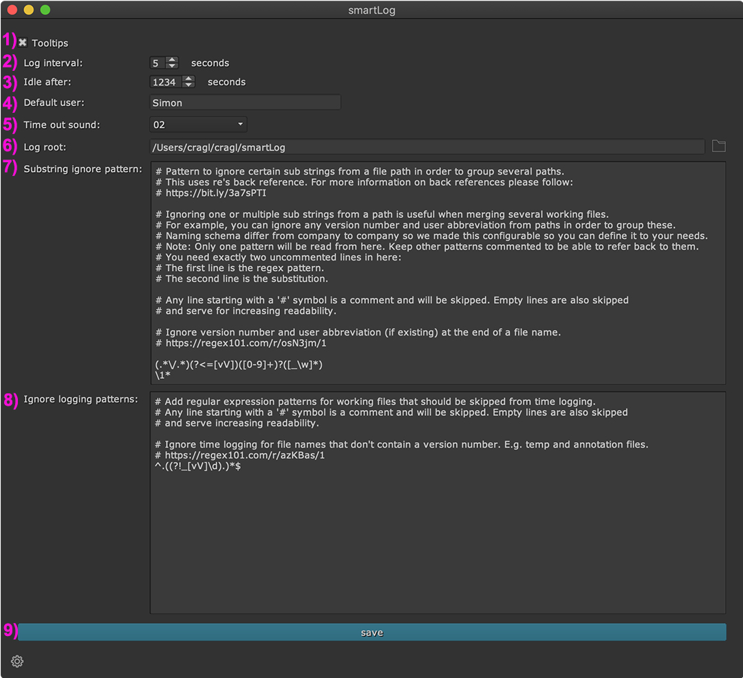 8) Ignore patterns: If a working file matches any of these patterns, smartLog will not log time to it. See Working with ignore patterns for more information.