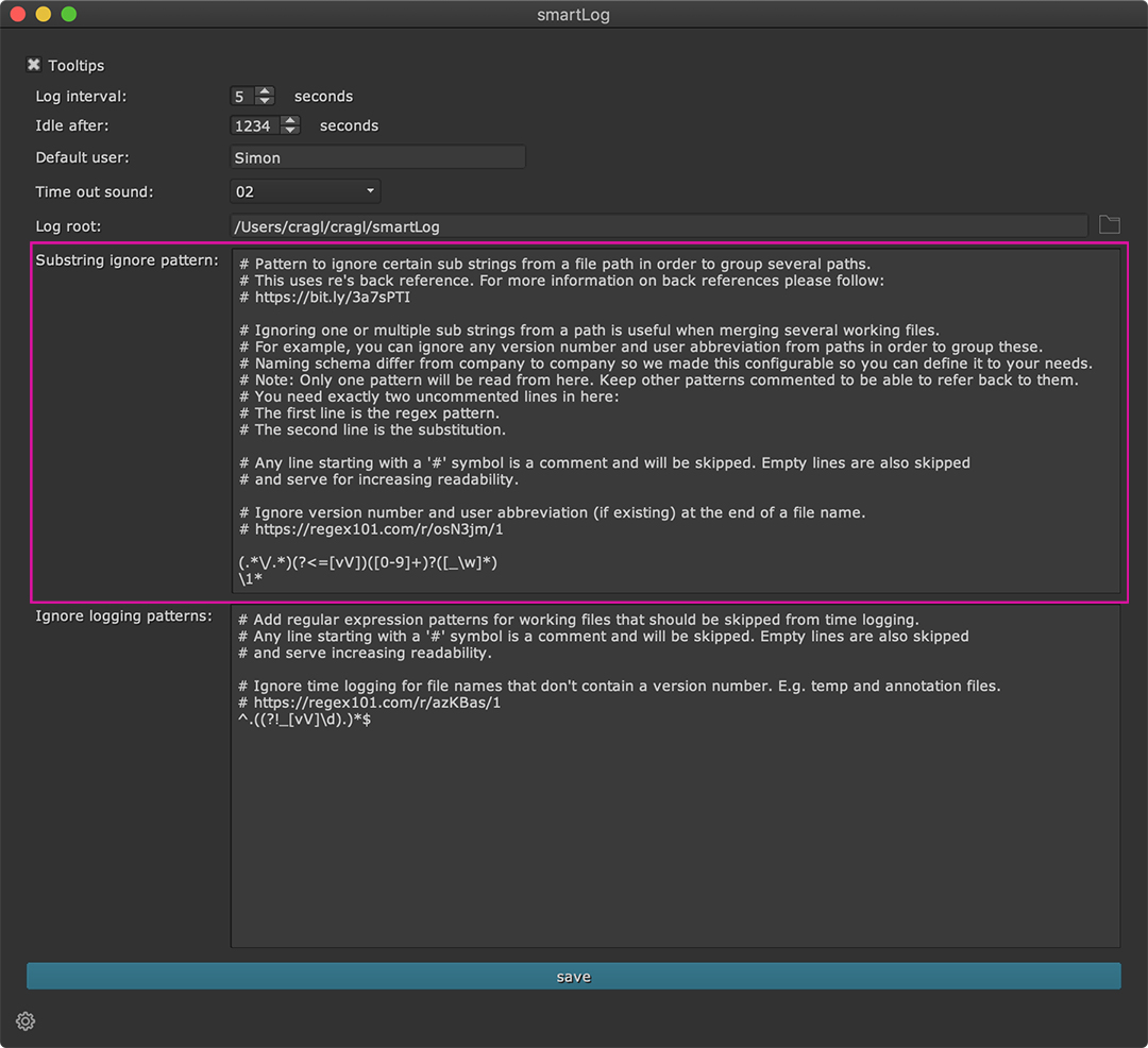 Sometimes we don’t want to time track certain working files. For example, consider quick temp files where we don’t require any version information as these are simply tiny working files without the need to use any version information. Or annotation files in NukeStudio/ Hiero. Having these time tracked would create unwanted time logs which we probably don’t want anyways. For that, we can add regular expression patterns to tell smartLog to ignore time tracking if a working file name matches a certain pattern. The setting’s Ignore patterns element as seen above was designed for that purpose. This is a text field which you can use to define regular expression patterns for working files that should be ignored.