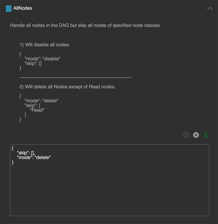 When having clicked the toggle, the step changes to advanced mode. In here you won’t have access to any more custom widgets but can enter the setup to use directly into the text area. The setup uses a standard JSON format. Each steps contains a description and multiple setup examples to show you possible configurations and their outcome.