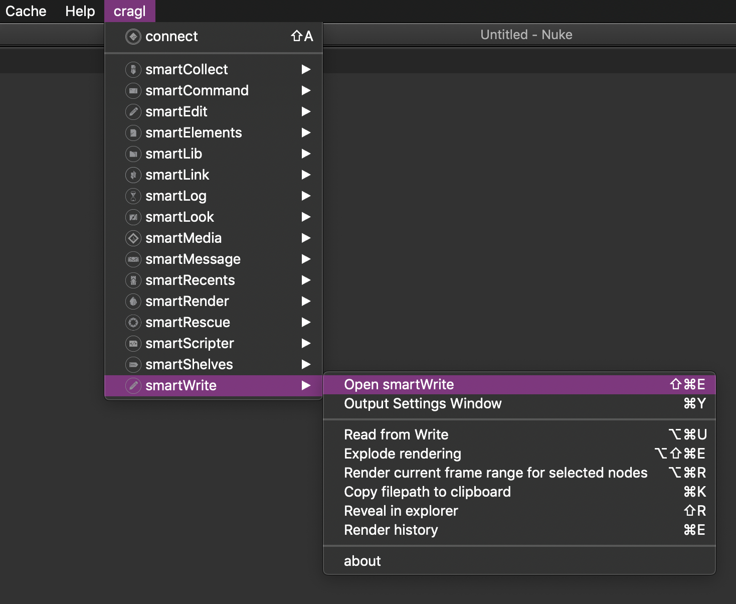 After the installation is finished, restart Nuke and you will now find the new sub menu smartWrite inside your cragl menu: