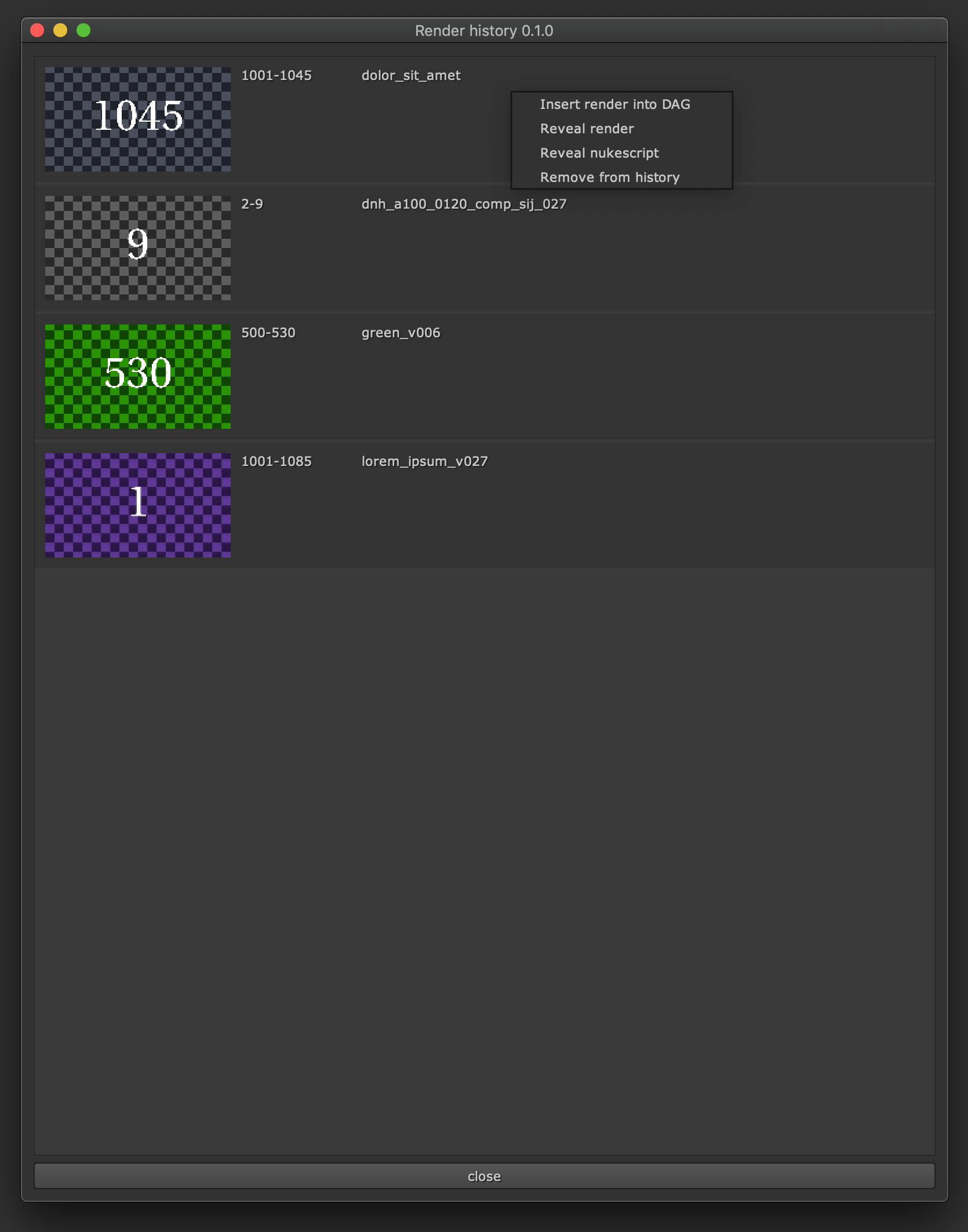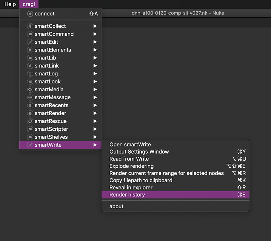 If enabled, the render history can be accessed via Nuke’s menu bar or using the assigned shortcut: