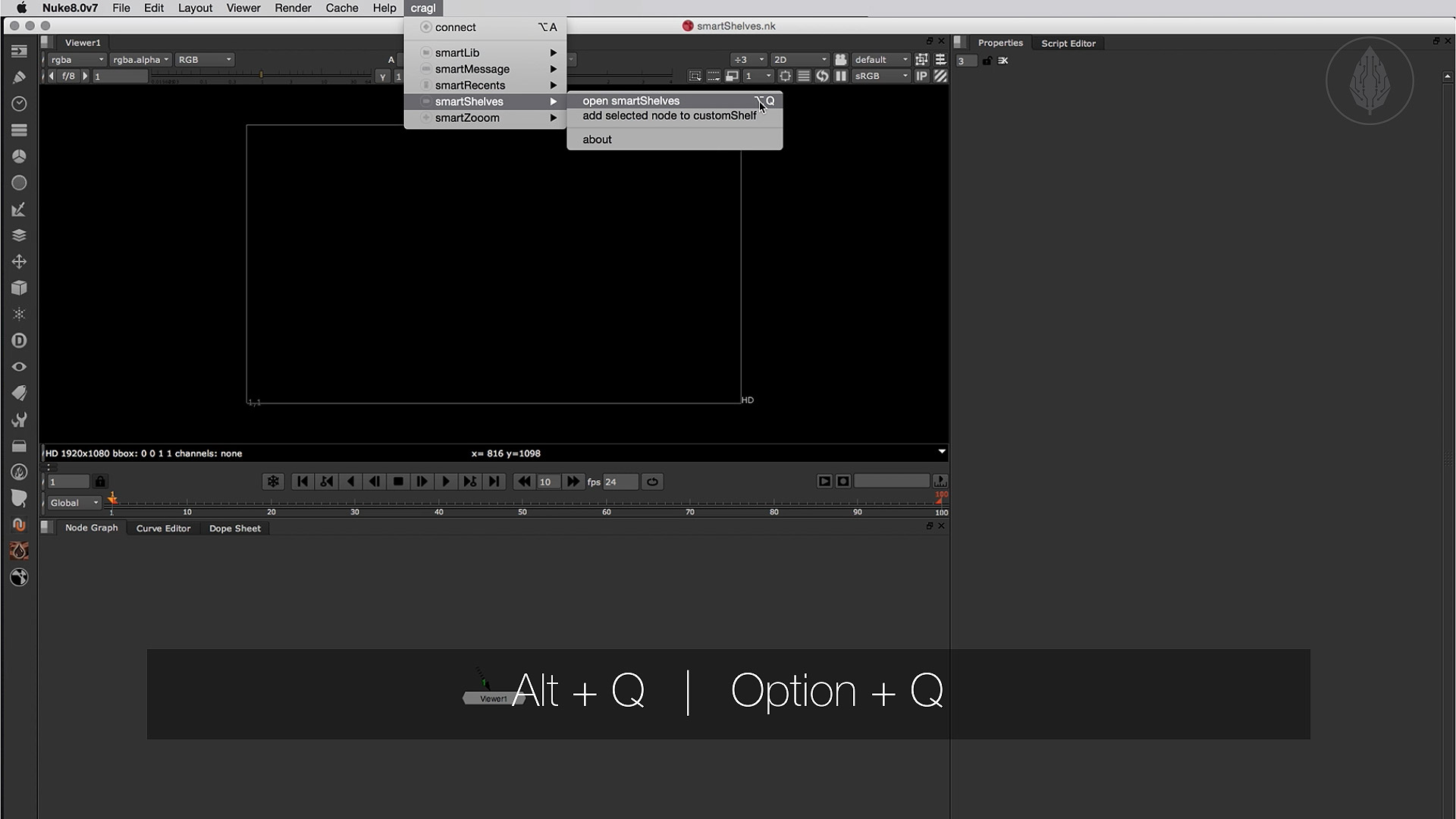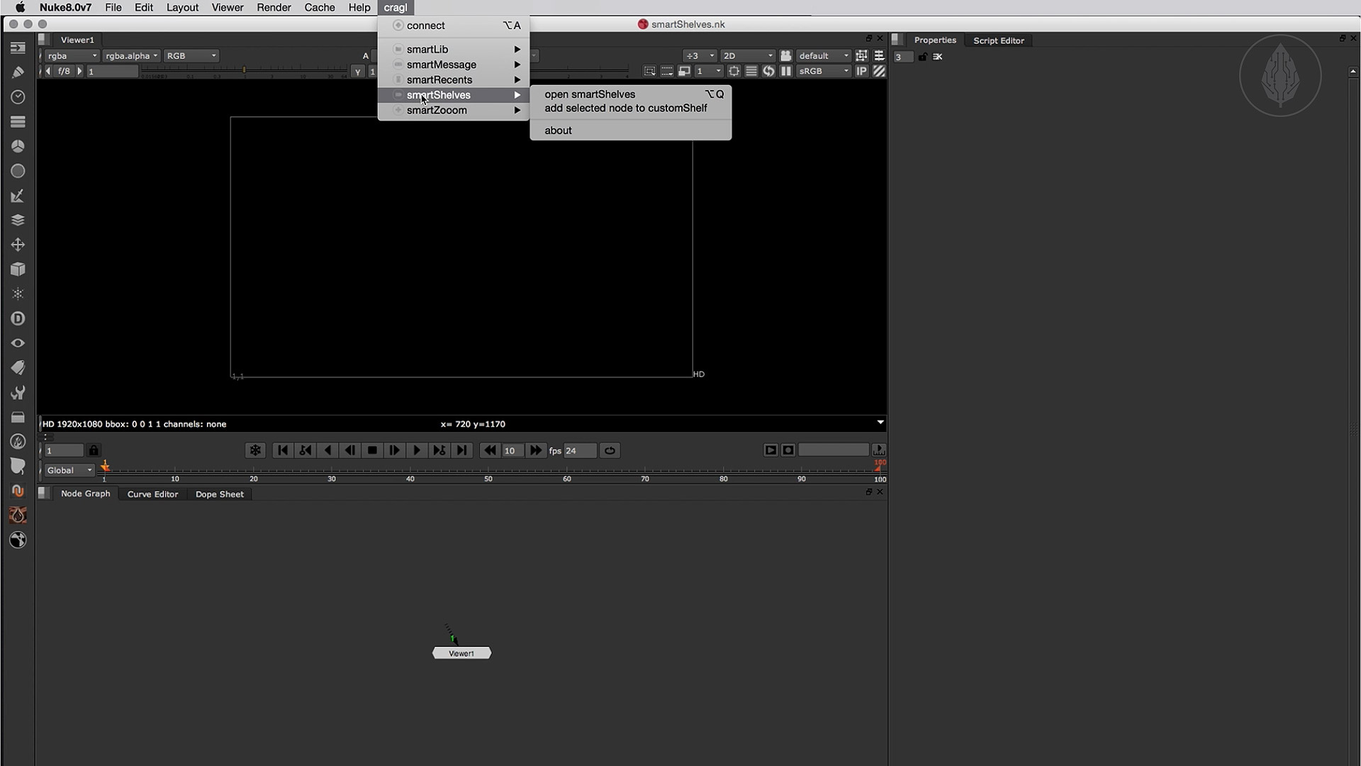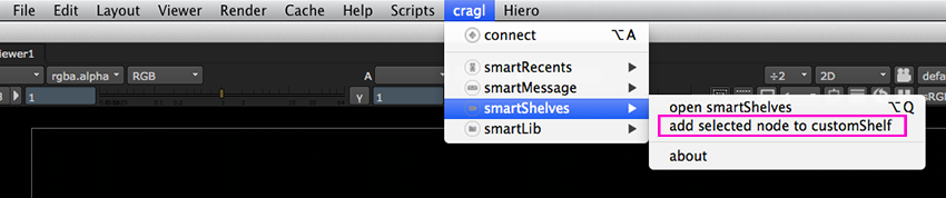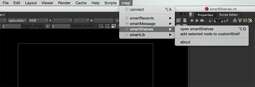 smartShelves can be accessed via NUKE's menu bar. Click on "cragl". In here you will now find the submenu "smartShelves" with its commands "open smartShelves", "add selected node to customShelf" and "about".