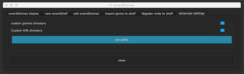 But you can also point to customized path. This can for instance be a gizmos repository on your server or in your cloud. All meta data for customShelves-, nodes- and gizmo settings will be saved to the shelves.xml which can also be set customized.