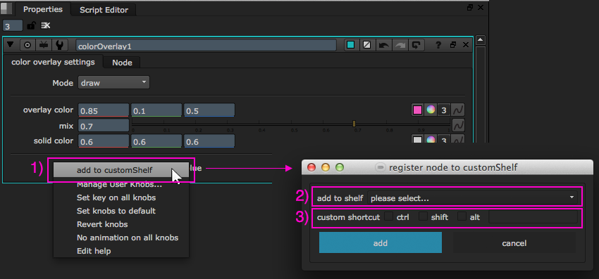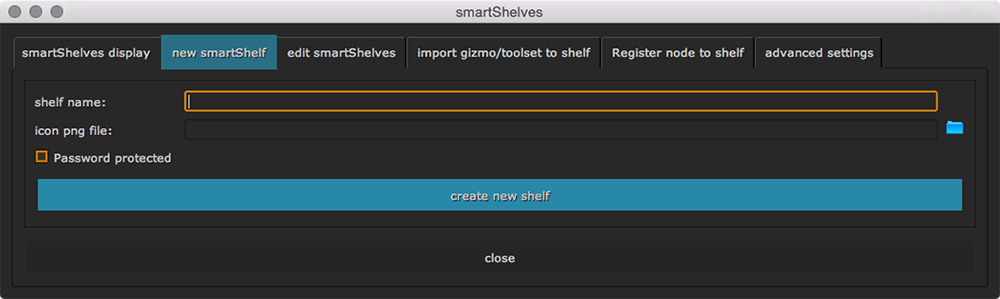 To register a node to a customShelf directly from within the smartShelves main window switch to the fifth tab "Register node to shelf".
