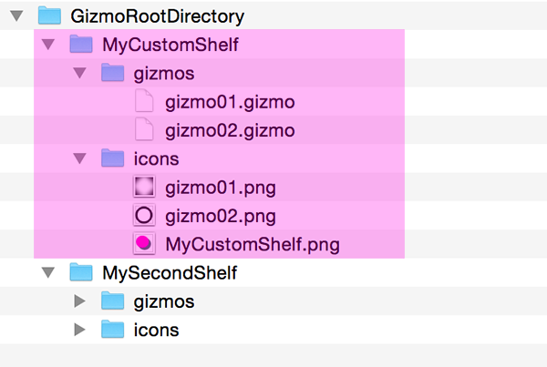 Each customShelf folder has this structure: Inside a customShelves folder you will find a "gizmos" folder and an "icons" folder. You can drop your gizmos and icons into the directories manually and the next time you launch NUKE these items will be added