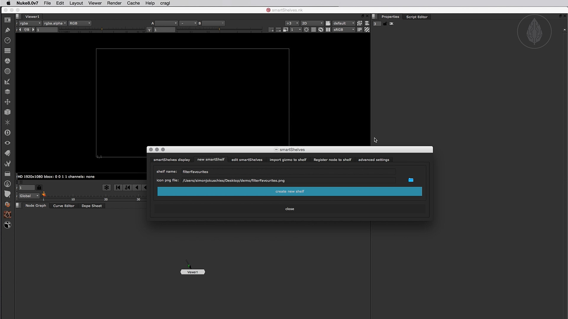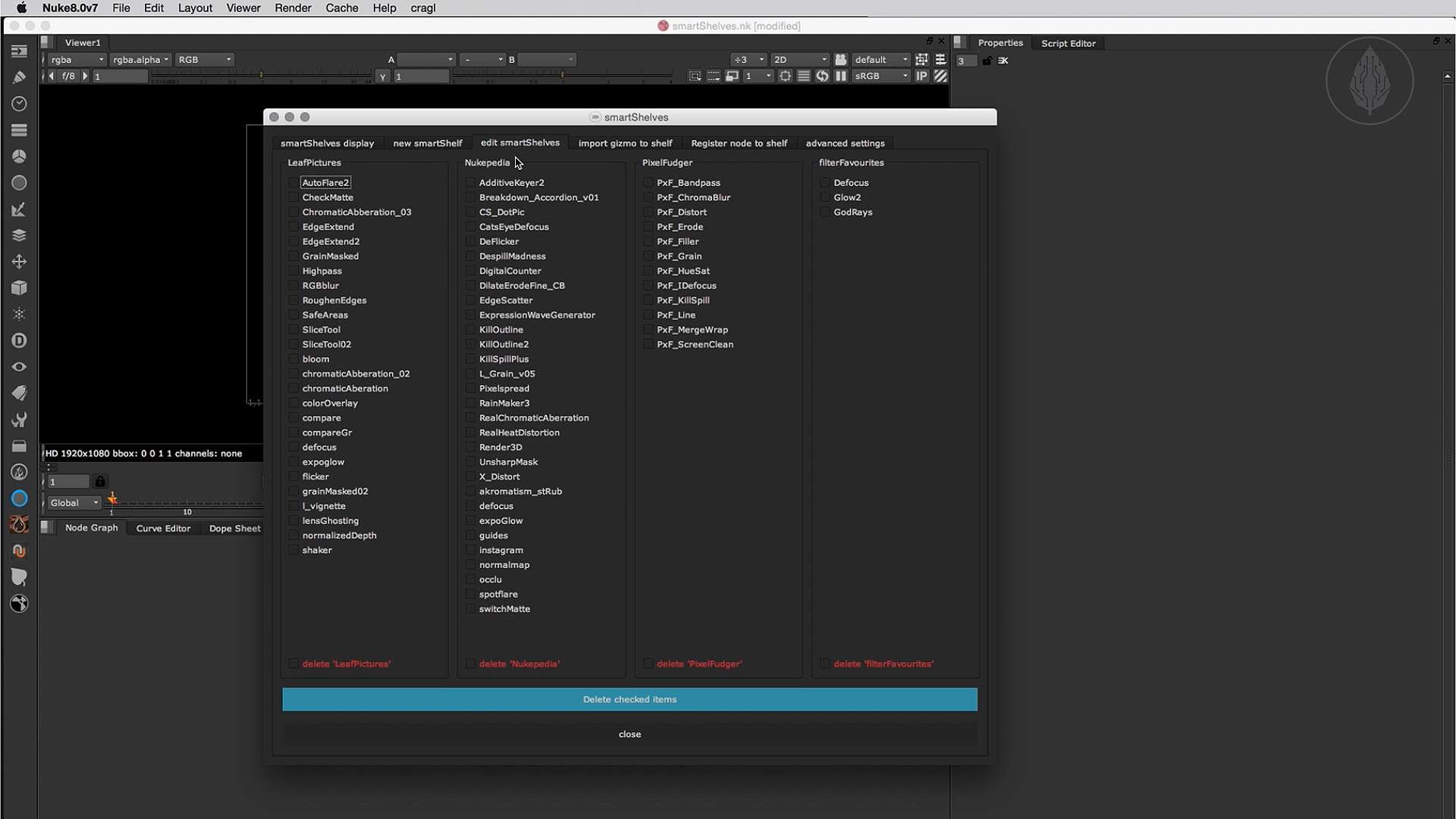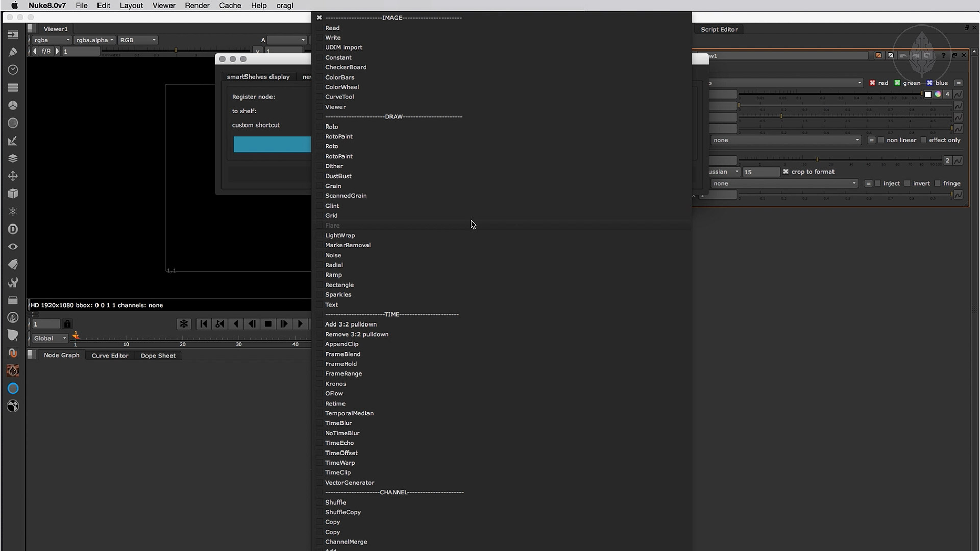 smartShelves lets you manage you custom shelves including nodes and gizmos in NUKE in a simple fast and intuitive way. You can always add new nodes and gizmos, assign shortcuts to them and edit and delete items whenever you like. You can use smartShelves also for your custom repository. Just link to a custom folder and all gizmos are installed automatically on your machine.