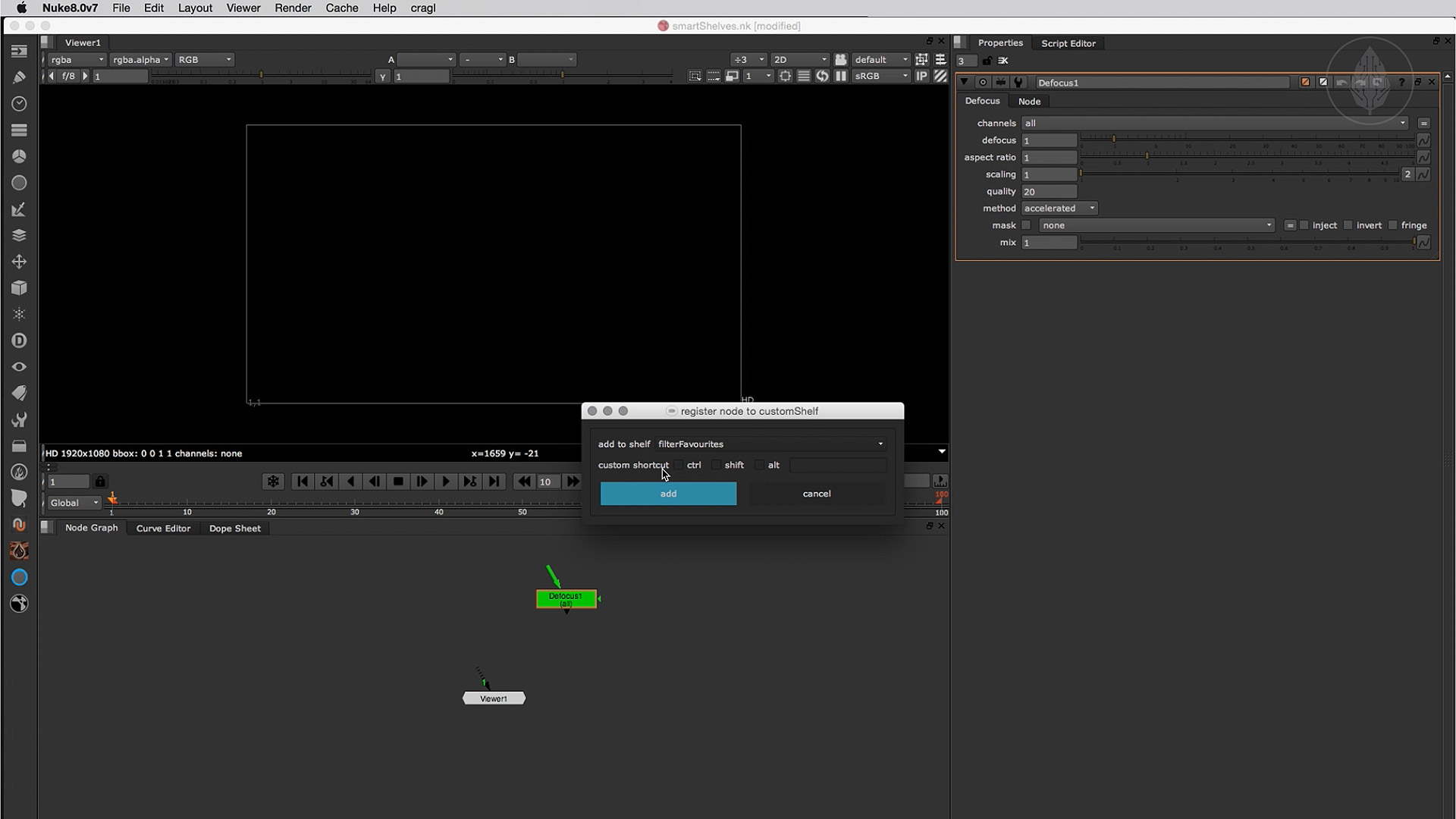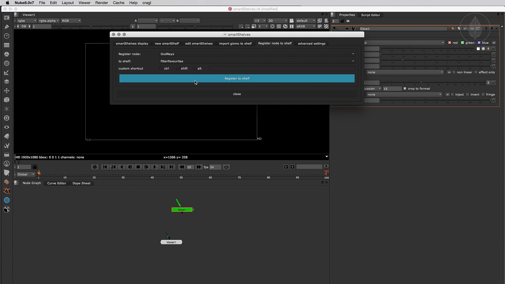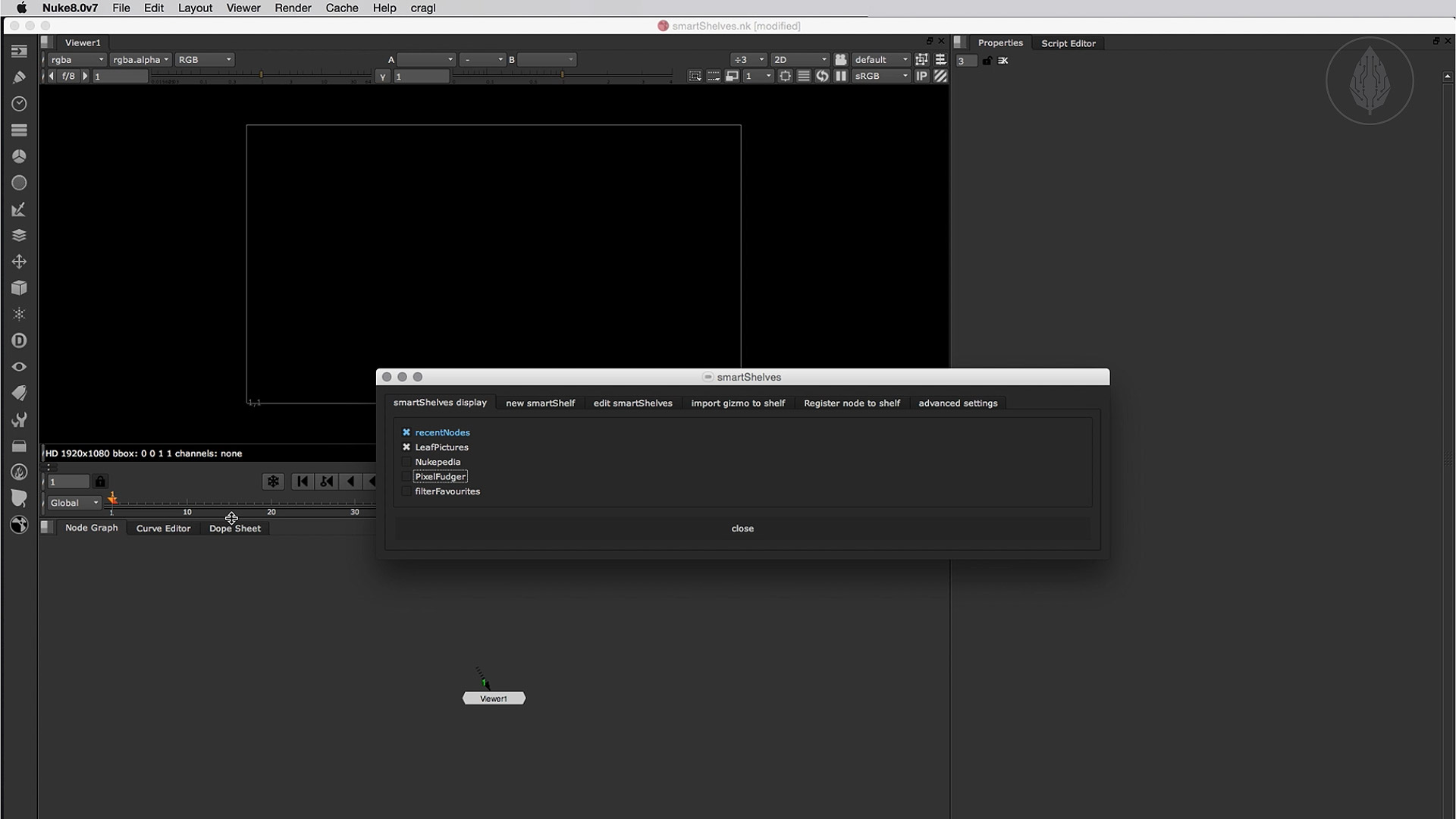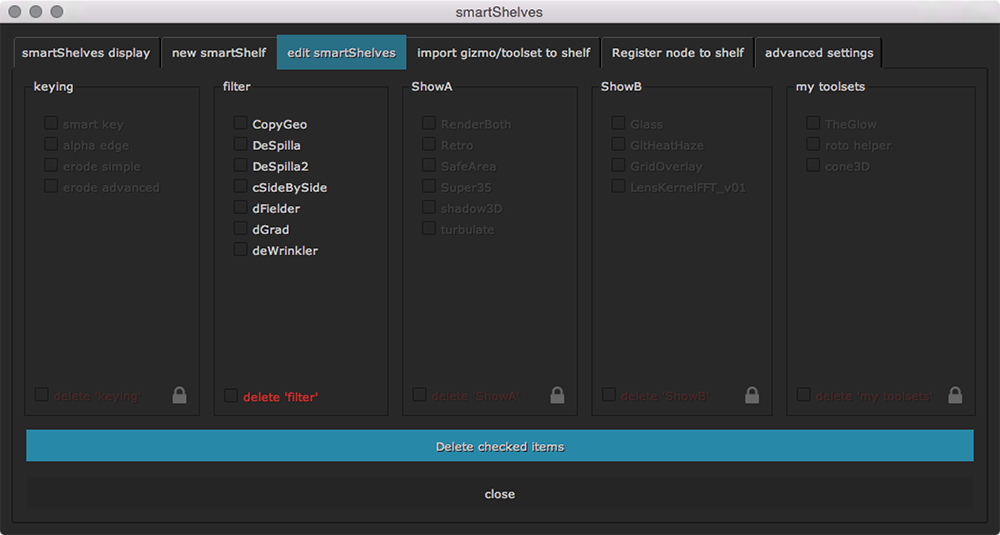 smartShelves lets you manage you custom shelves including nodes and gizmos in NUKE in a simple fast and intuitive way. You can always add new nodes and gizmos, assign shortcuts to them and edit and delete items whenever you like. You can use smartShelves also for your custom repository. Just link to a custom folder and all gizmos are installed automatically on your machine.