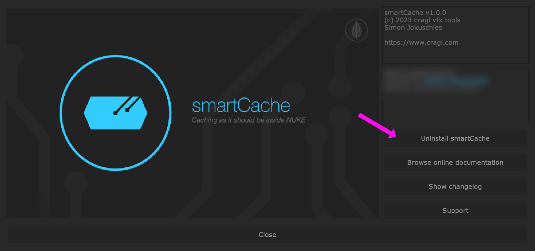 Alternatively, uninstall smartCache from its about window. Navigate to Nuke’s menu bar and execute: cragl -> smartCache -> about and in the upcoming window click the ‘Uninstall smartCache’ button and confirm the uninstall.