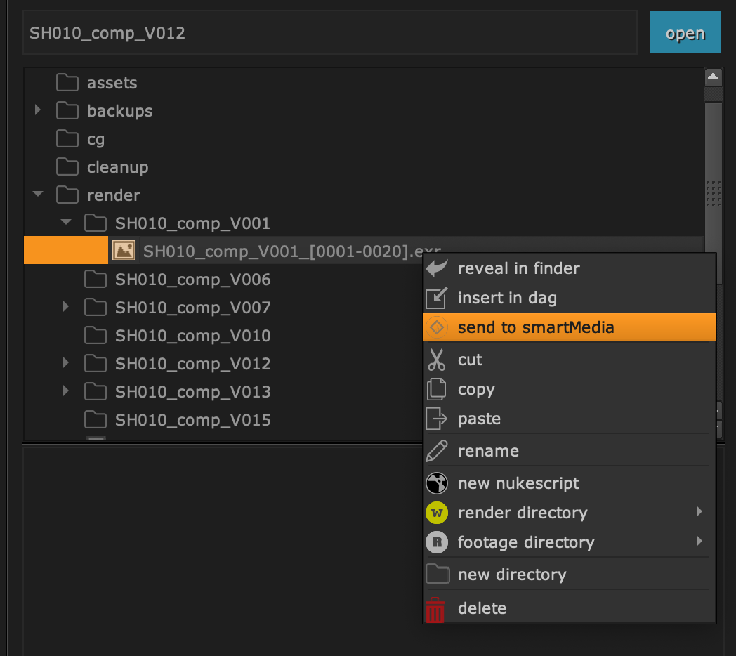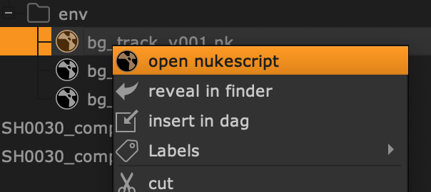 Insert into dag - in the currentShot section right click a file, image sequence or nukescript and choose “insert in dag”. This will insert the selected item into your node graph.