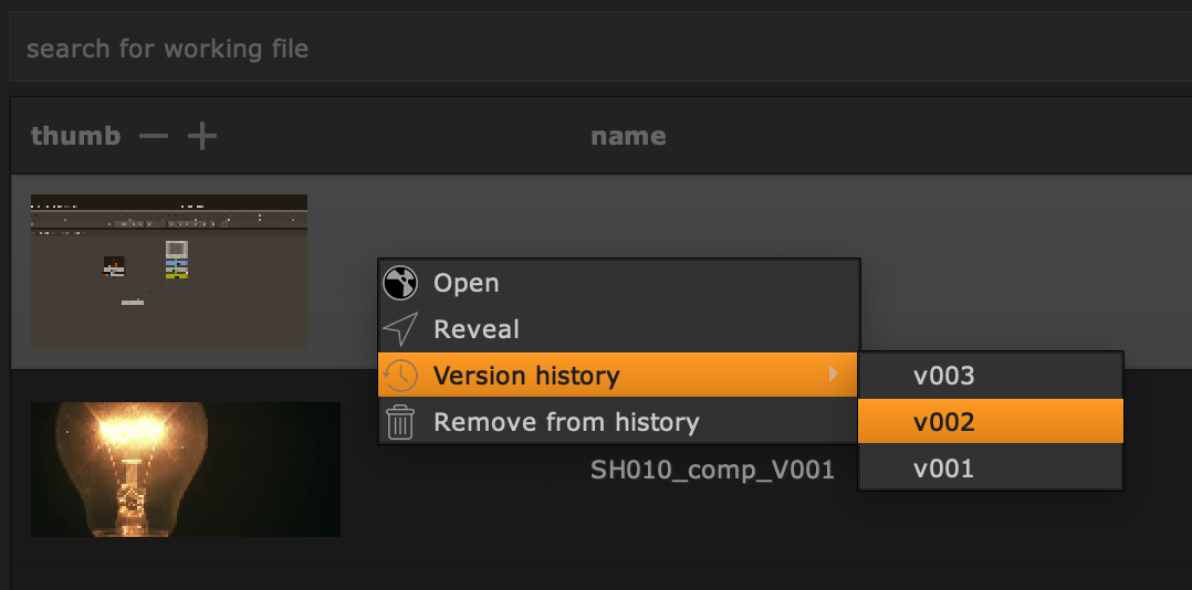 The smartRecents window contains now three new columns to give you additional information about your history. You get the file size, used Nuke version and used Nuke variant for each working file.