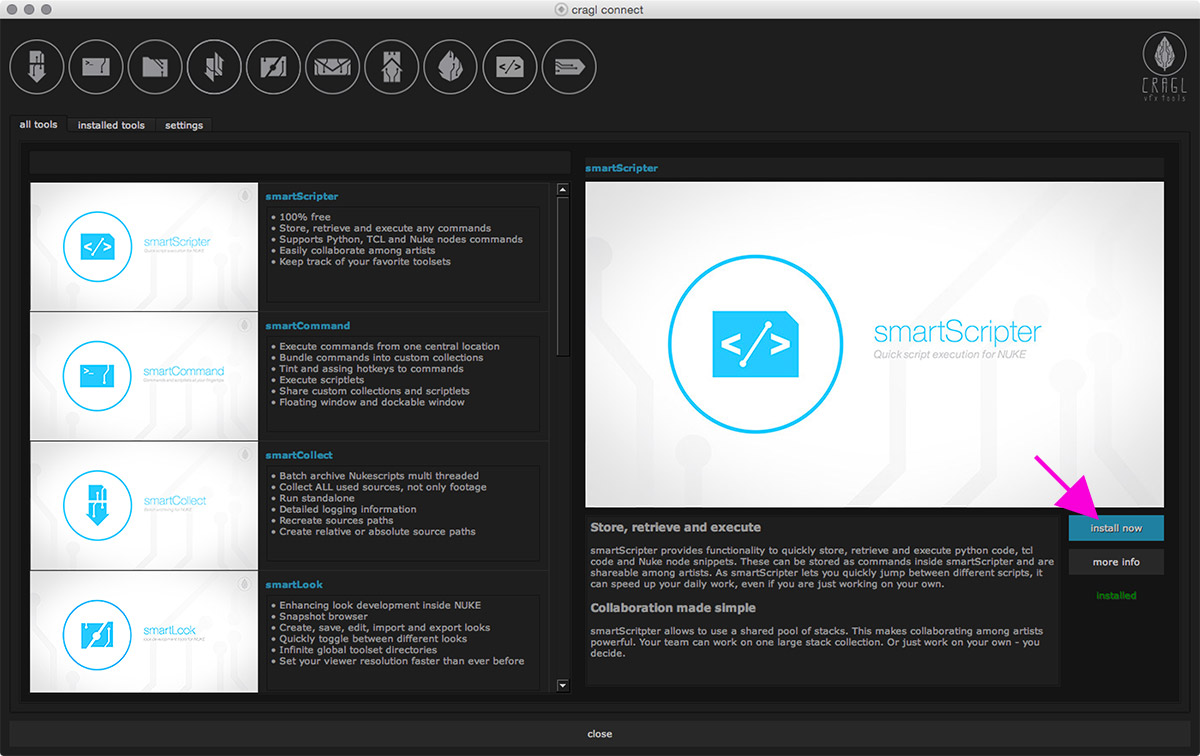 Like any other cragl product, smartScripter can be installed with cragl connect directly inside Nuke.