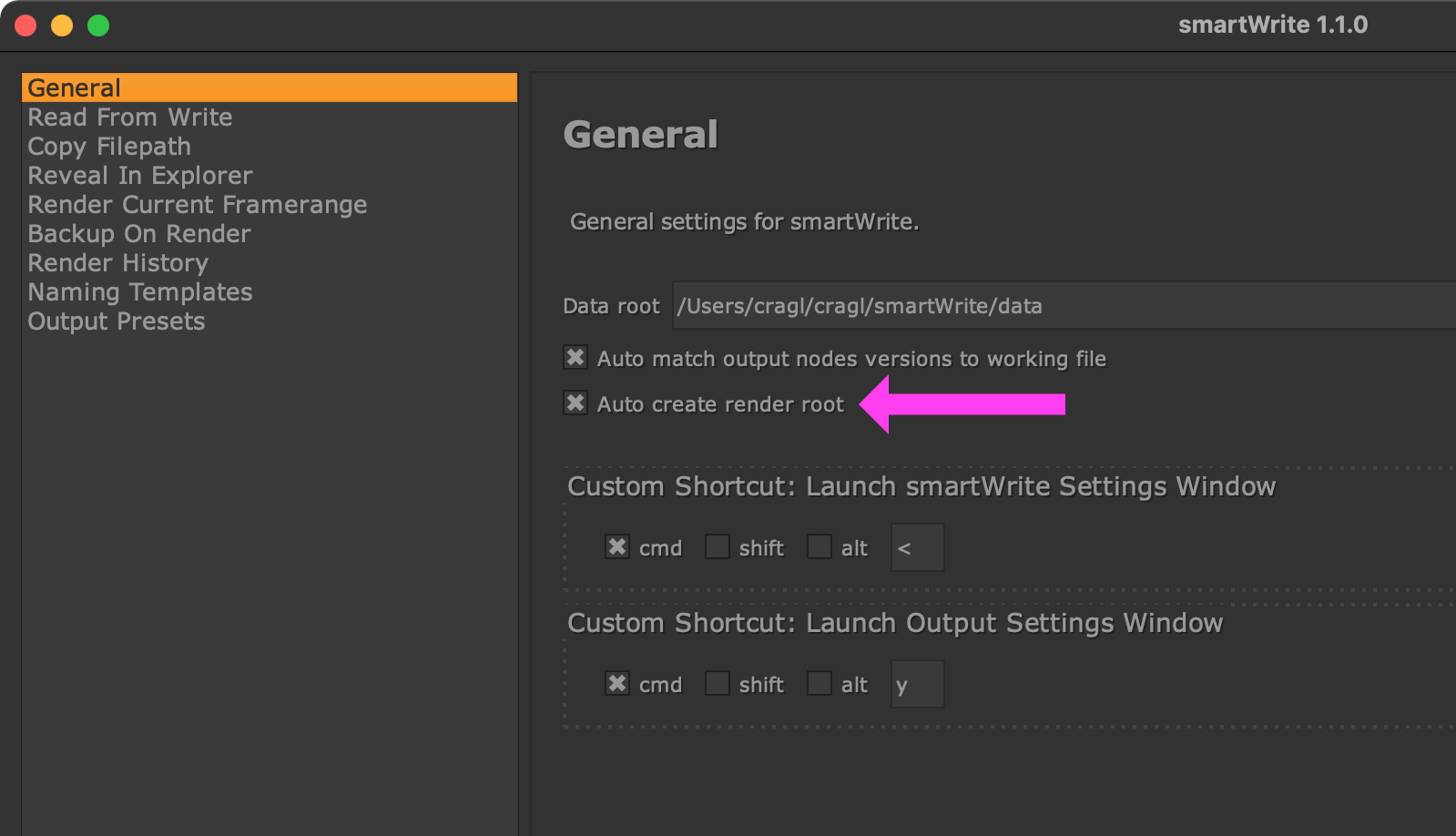 The ‘Auto create render root’ checkbox in the ‘General’ section ensures that the render directories for output nodes exist before starting the render processes.